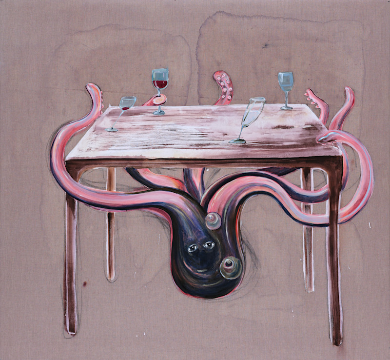 The kinetic installation piece The Eternal Dinner sees Isæus-Berlin return to water. She has explored this equally destructive and life-giving element throughout her career, from submerged living rooms to erupting fountains, in works such as Ett vattenhem (2001) and Uppvaknandet/Awakening (2014-2015). Here, its cyclical and temporal aspects are highlighted as the water is gently rocked in a continuous cycle of ebb and flow. The dinner table, set for four, reappears in a painting that imagines an octopus as the source of the motion.