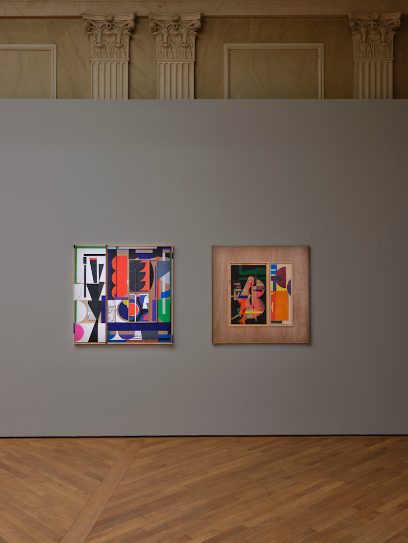 Ohad Meromi Untitled (Agit-train 2), 2024, collage and acrylic on wood, 98 x 98 cm