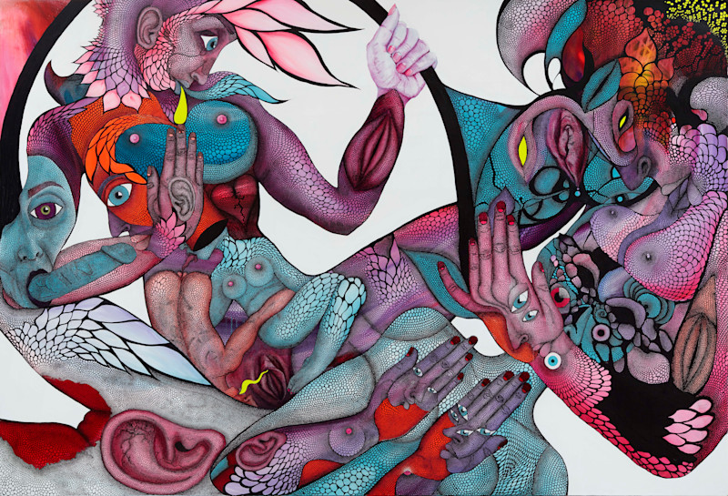 Carolina Falkholt, Genom min svarta blick och ut ur min fitta, 2021, Acrylic and pencils on canvas, 170 x 250 cm
