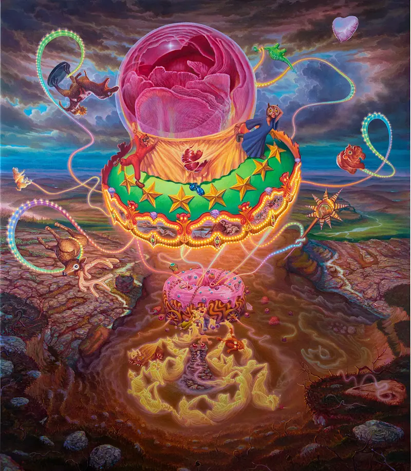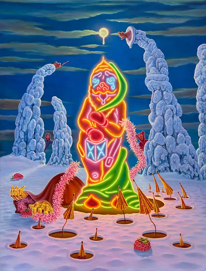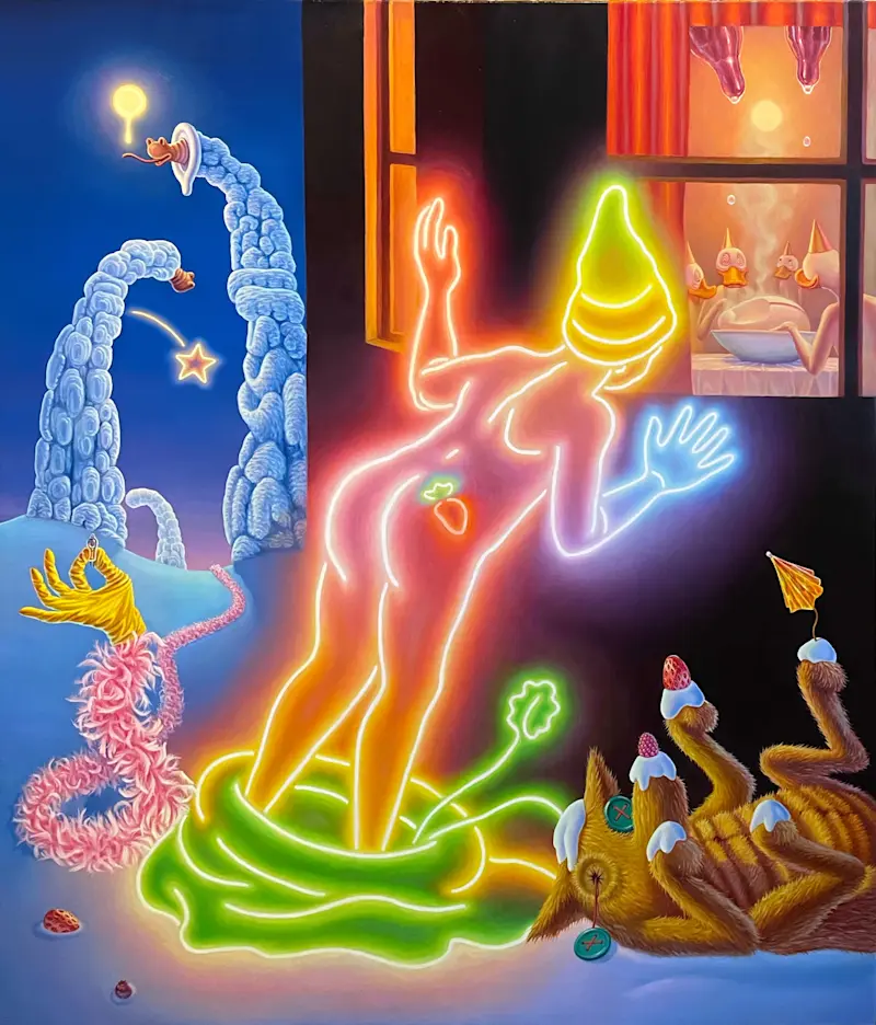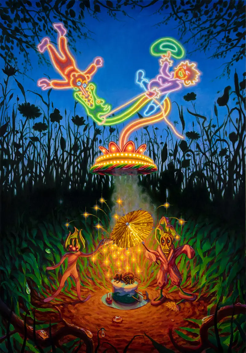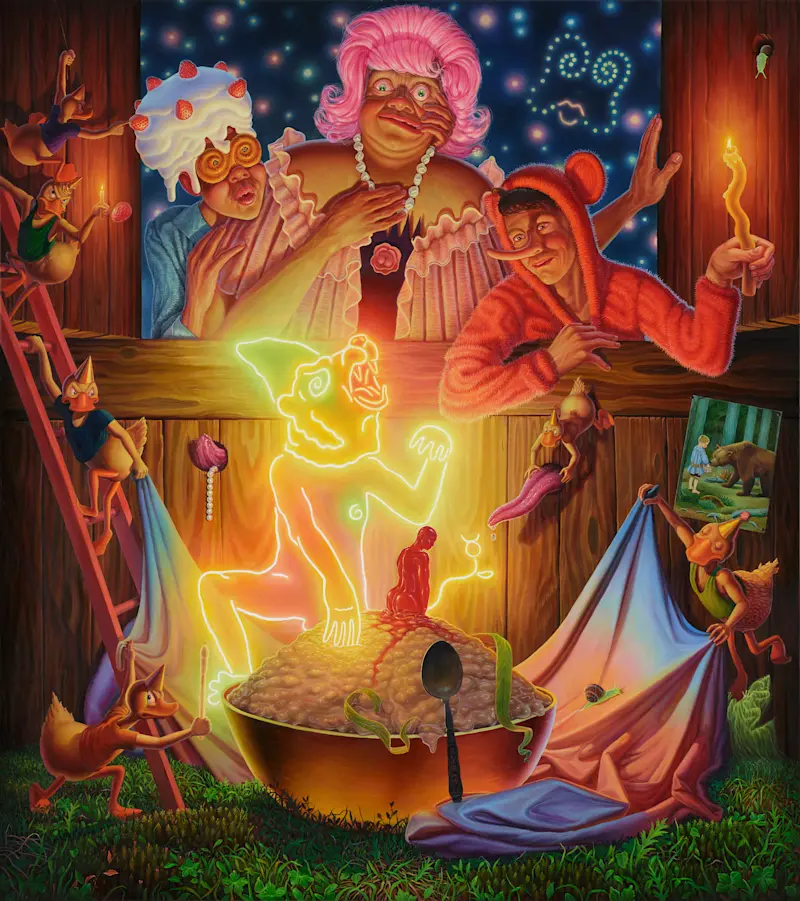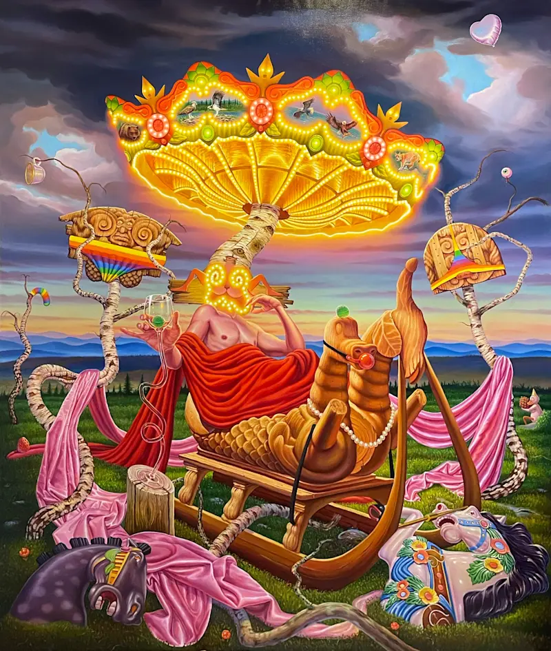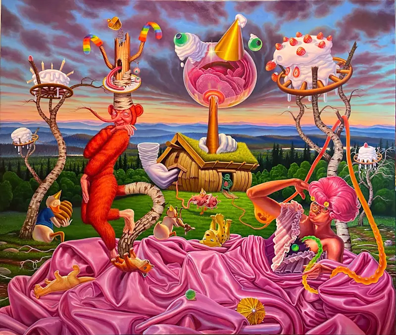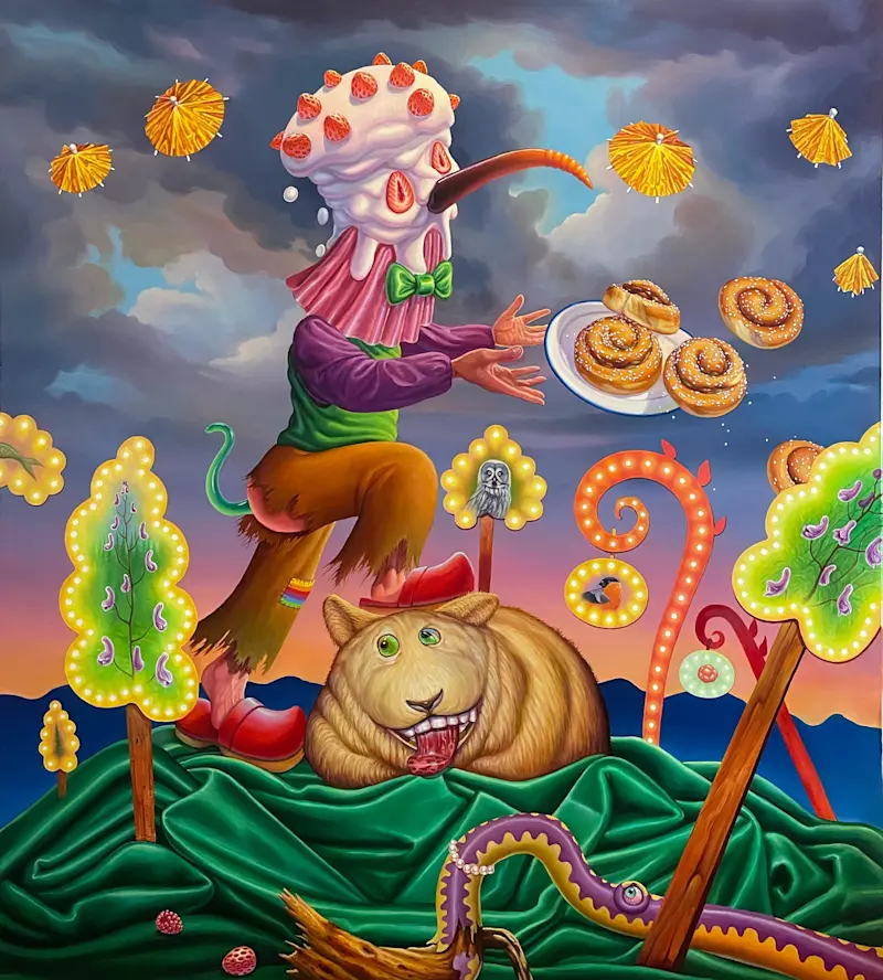 Adam Ytterberg's artistry captivates viewers with its rich narrative quality. Reminiscent of classic children's stories but tinged with a darker, satirical edge, Ytterberg’s work addresses contemporary themes such as identity, sexuality, and environmental degradation. His paintings serve as intricate visual sagas, each a fragment of a larger narrative that explores the complexities of human experience through the lens of whimsical, yet profound storytelling.