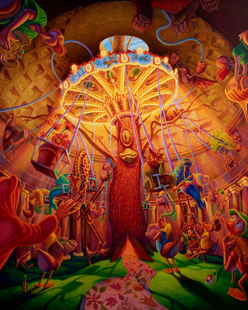 Influenced by artists like Otto Dix, Jenny Nyström, and Carl Barks, Ytterberg's work combines dystopian elements with a playful, almost cartoon-like aesthetic. His use of colour and form creates a sense of enchantment, drawing viewers into immersive worlds that blend reality with fantasy.