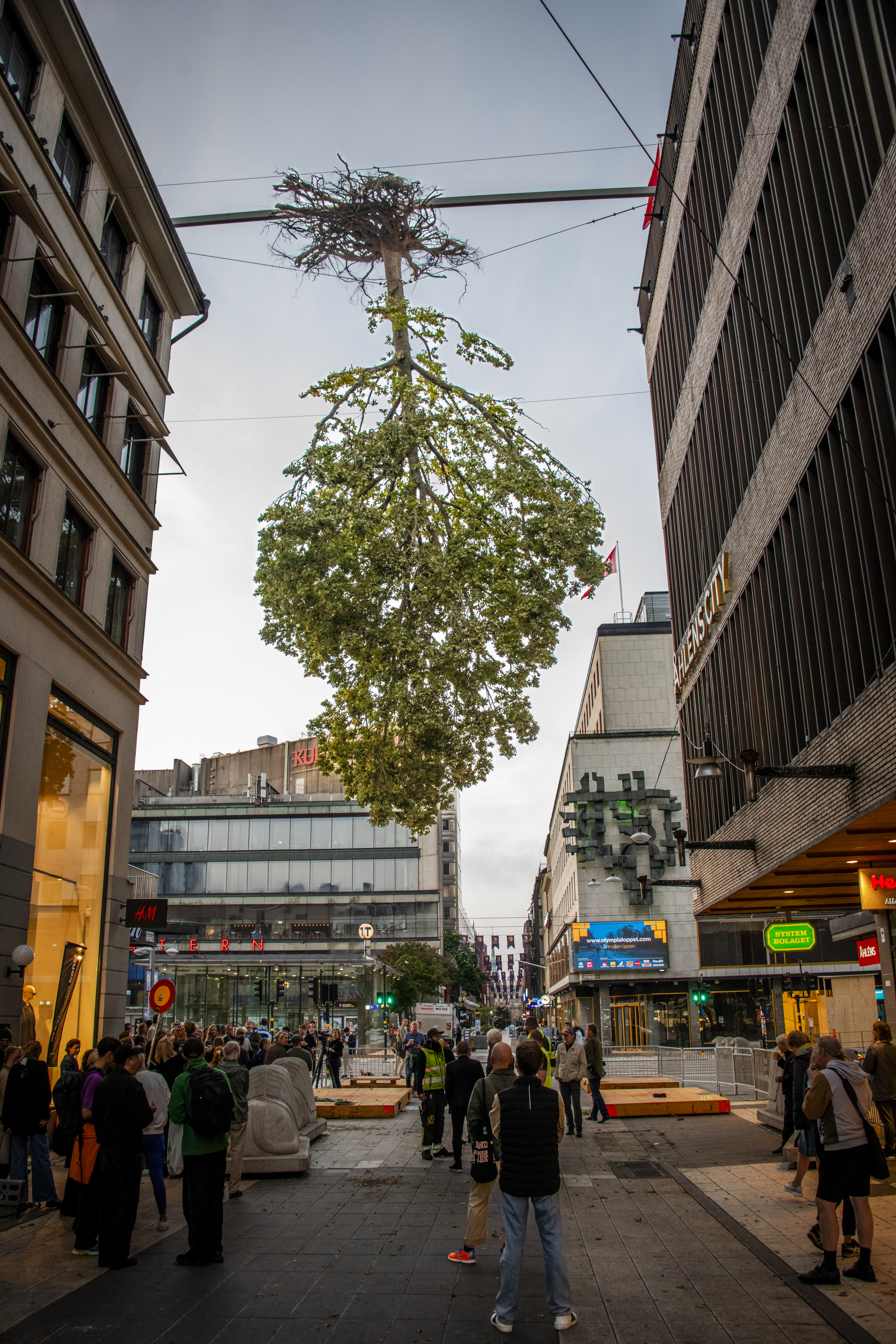 SVT Nyheter: ”Dö för dig/ slå rot” – Här hängs jätteträdet upp på Drottninggatan